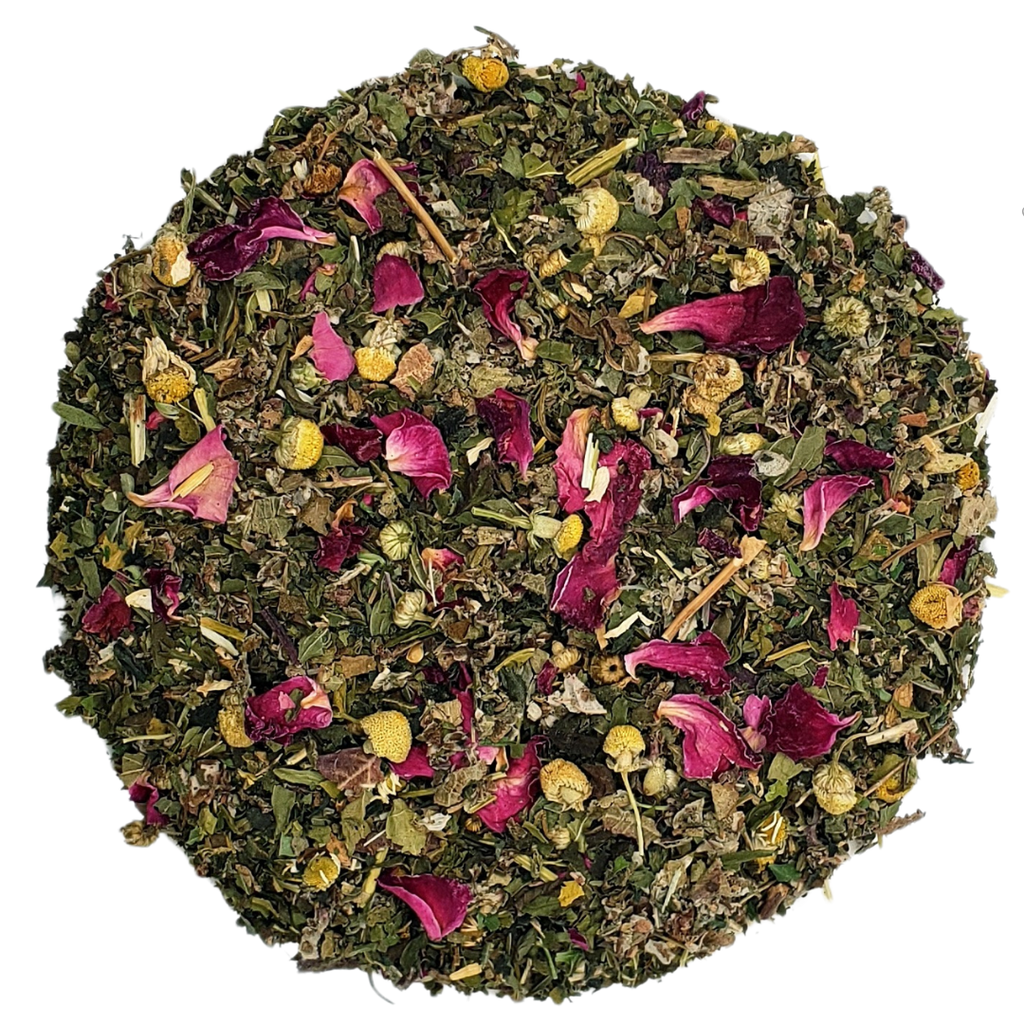 Proprietary blend of organic nettle leaf, raspberry leaf, peppermint, skullcap, chamomile and rose petals.